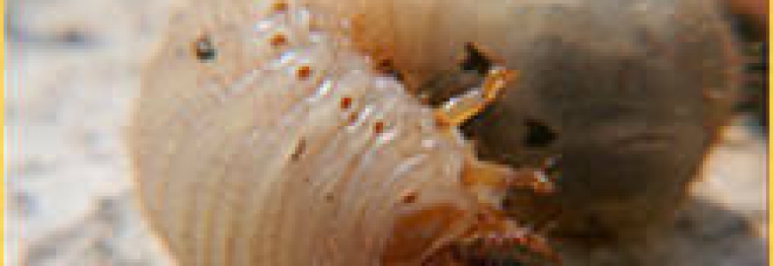• Description de la larve : corps arqué de coloration blanchâtre à jaunâtre recouvert d’une faible pilosité dorée. Mandibules brunâtres. À maturité, la larve peut atteindre 4 à 5 mm de long et 2 mm de large.